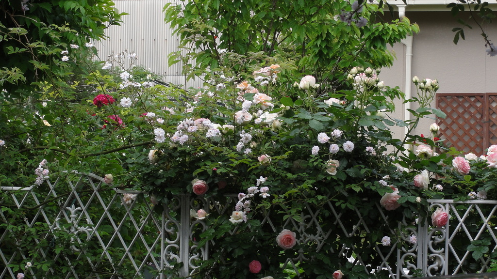 前庭正面フェンスにバラ這わせています。L-CL ピエール・ド・ロンサールF ブライダルピンクOD-HP バロン・ジロー・ド・ラン S ローブリッターHMsk ポールズ・ヒマラヤン・ムスク 2011/05/22
