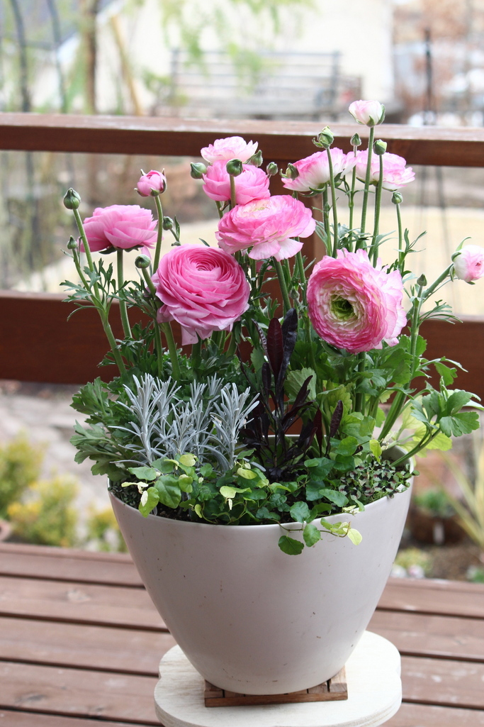 ラナンキュラスの華やかさがすっかり気に入り 今シーズン2つ目のラナン寄せ植えです。前回と似てますけど…