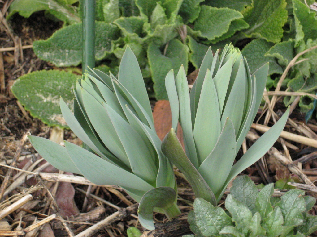 フリチラリア・ペルシカ 2日前には何も無かった地面に灰白色の葉が出てきました。