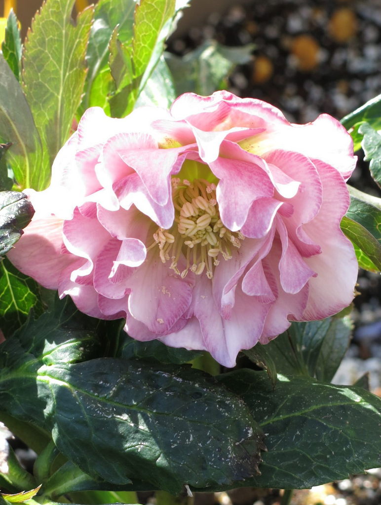 ピンクの八重咲きクリスマスローズ。(アシュードエレガンスパールピンク)2年半経ちやっと咲きました。嬉しい〜o(^▽^)o