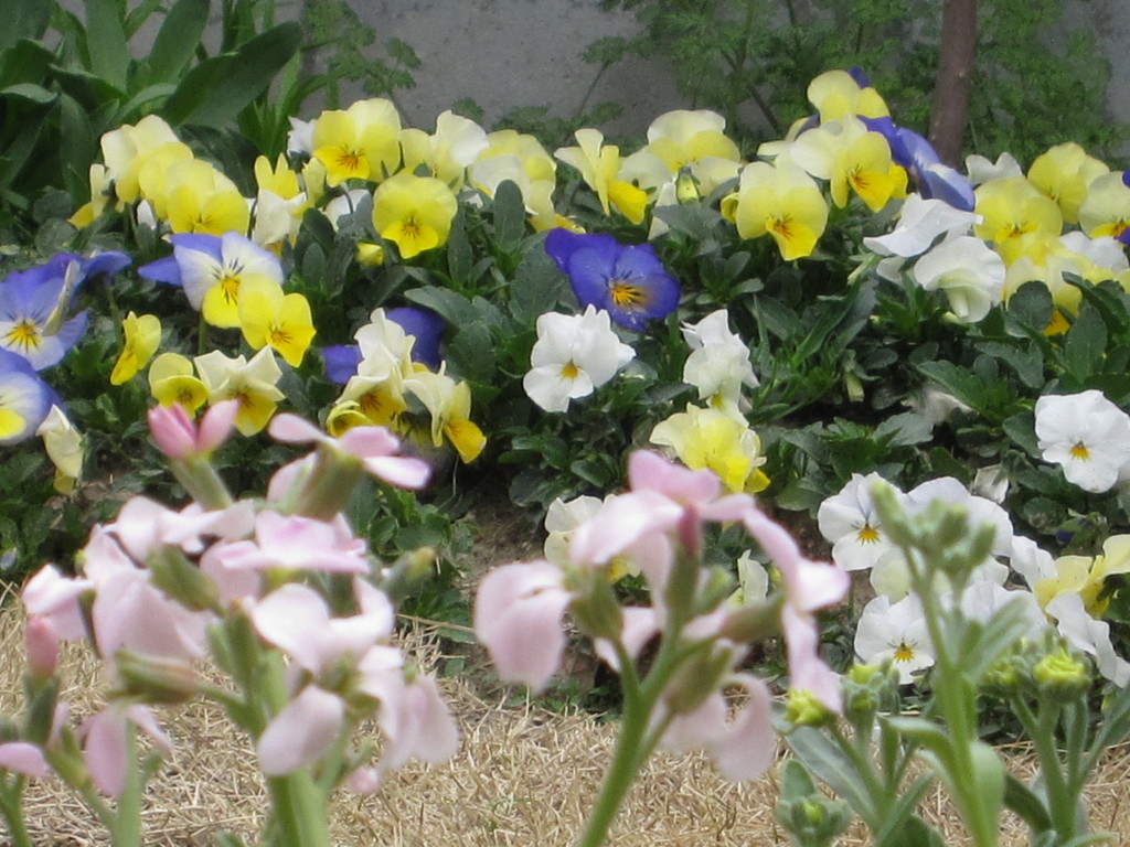 ビオラのスモールなところが大好きで毎年組み合わせては楽しんでます。ホワイトとイエローの中にパンジー モルファを組み合わせてみました。