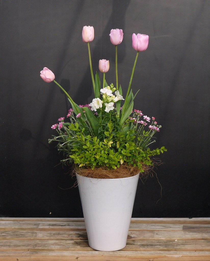 可愛いピンクのチューリップがあったので寄せ植えにしてみました。