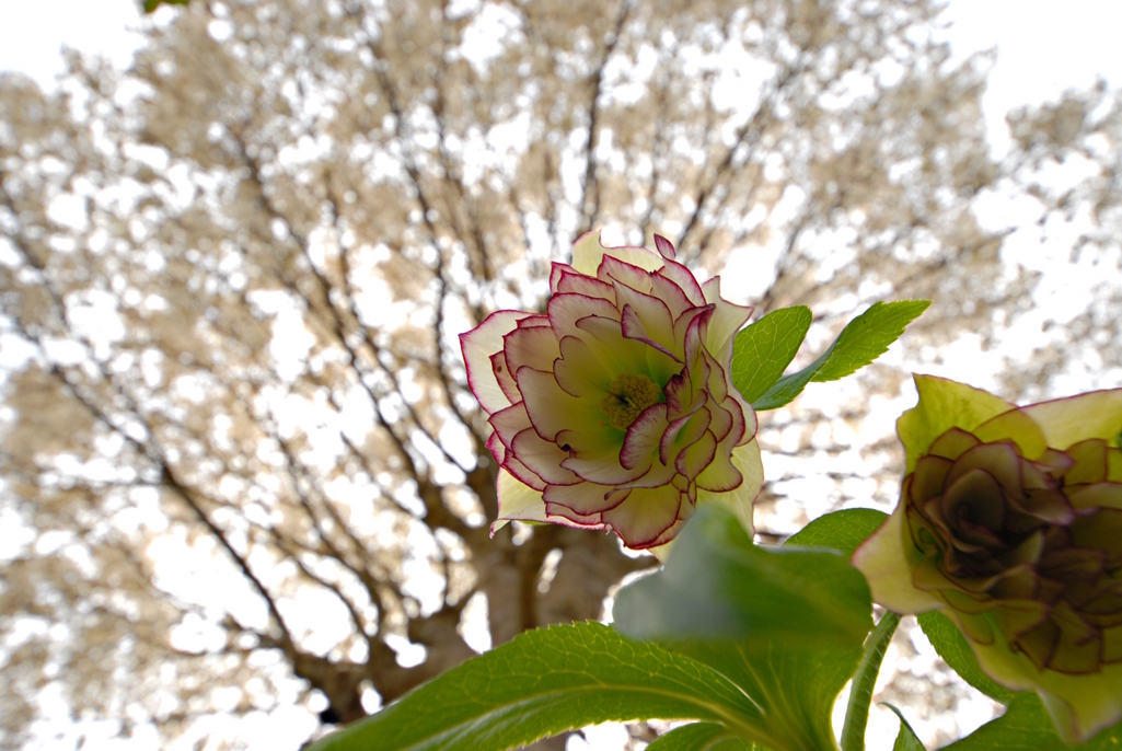 満開のコブシを背景にお洒落なクリスマスローズ、すてきな一枚です。