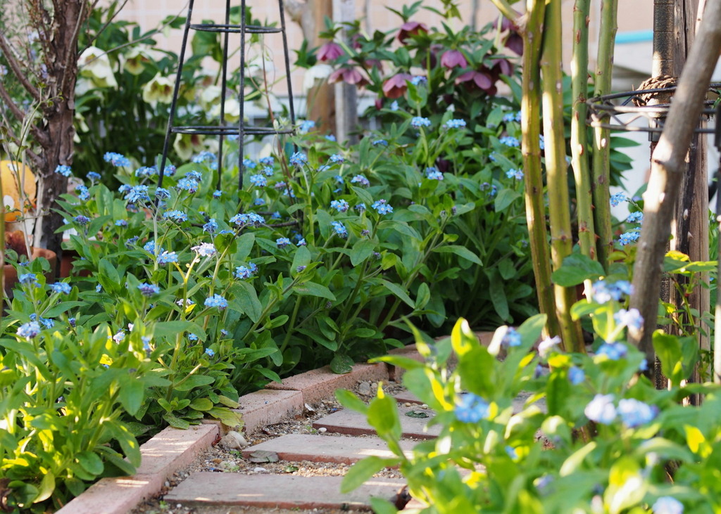 小路に咲くワスレナグサがカーブの行く先の期待感をいっそう高めてくれていますね。