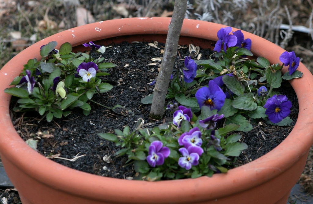 クラブアップルの鉢に昨年秋に植えたビオラ。ほとんど2か月の間雪に埋もれていたのですが、春の訪れを感じるとともに綺麗な花を咲かせ始めました。