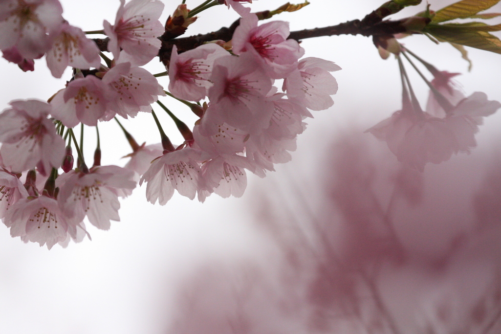 透明感のある優しいピンクが白い空に映えて