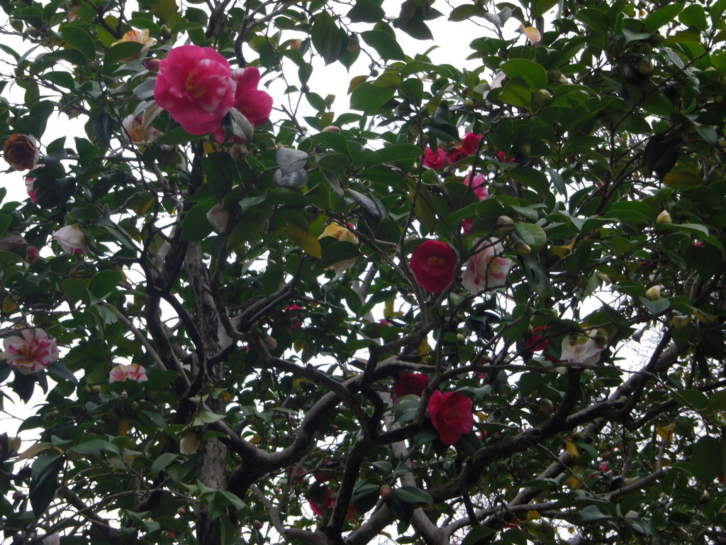 有名な五色椿だそうです。高いところに花が咲き、私の腕ではよく撮れませんでした。