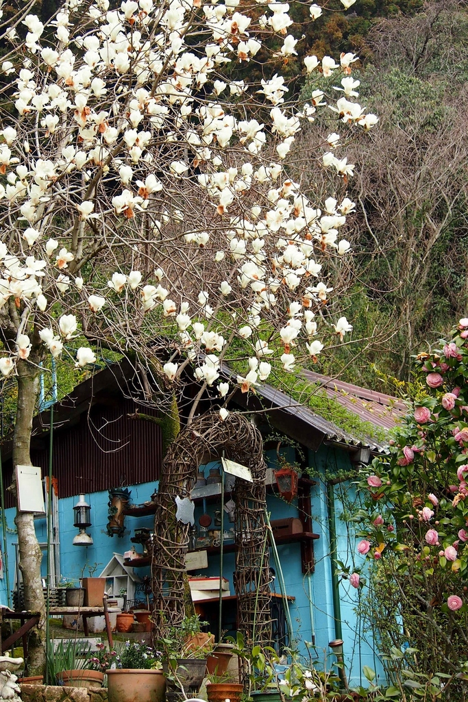 白木蓮とブルーの小屋、似合っています^^隣のピンクの椿も加わってステキですね。