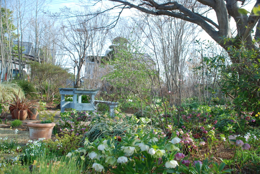 クリスマスローズが上から春の芽吹きを見守っているように見えますね。