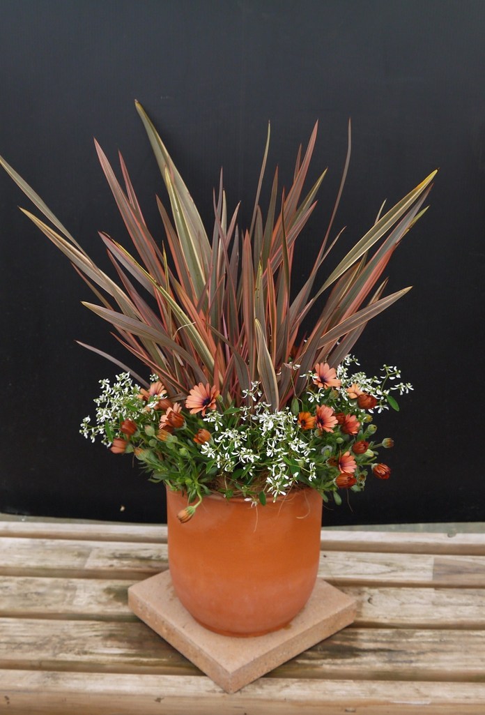 以前作った寄せ植えをニューサイランだけ残してオステオスペルマムとダイアモンドフロストで植えなおしました。