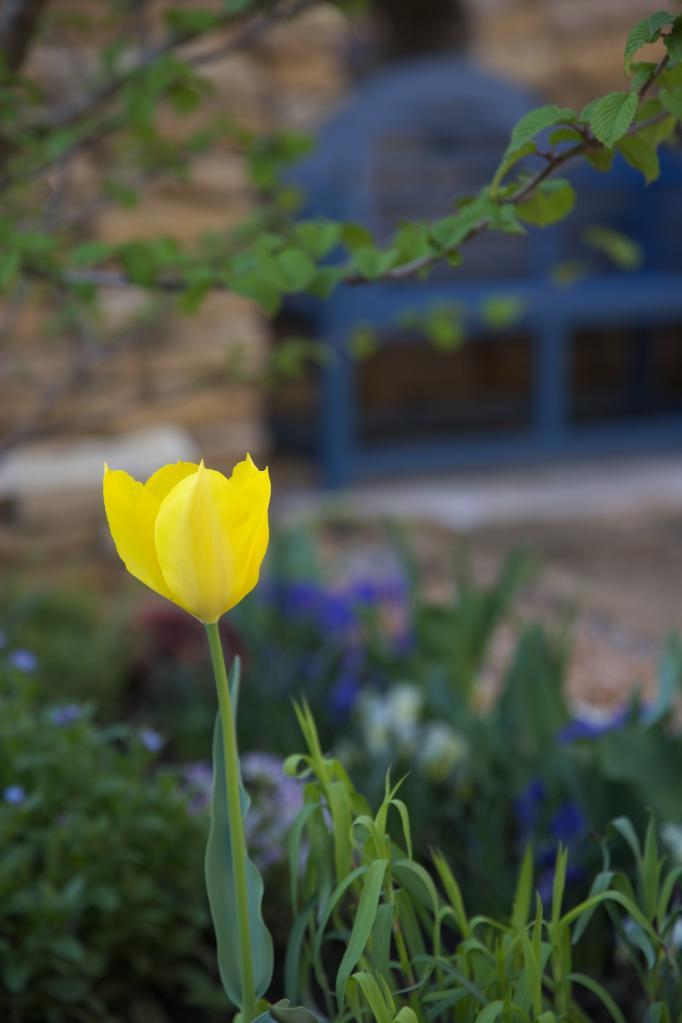 ベンチや花々のブルーの組み合わせに
