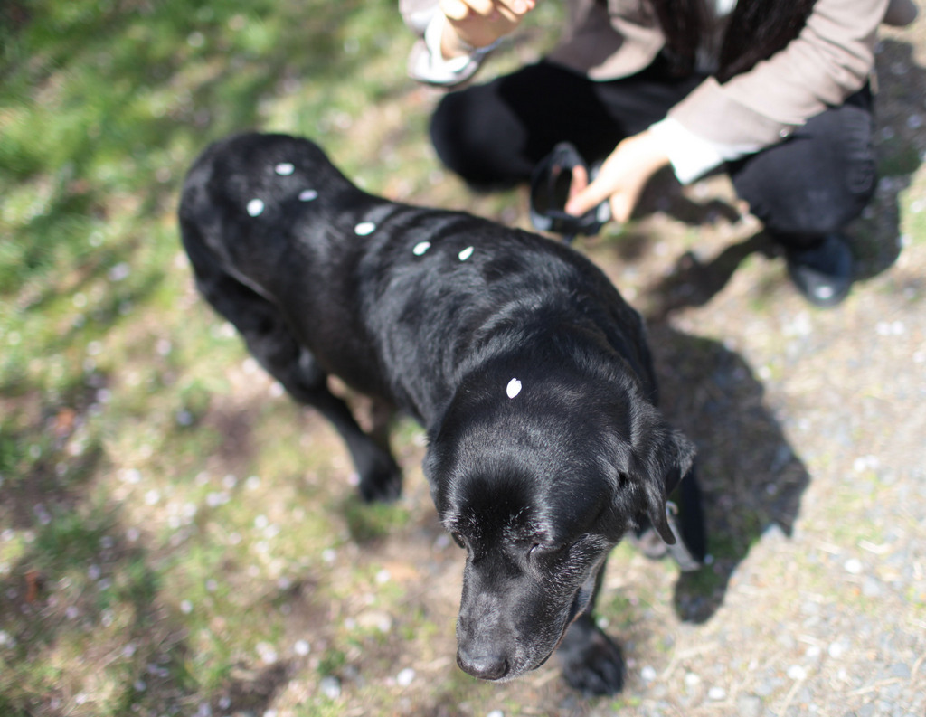 黒ラブちゃんに花びらとっても似合ってますね^^まゆ毛のあたりが白いのでもうお年なのかな?わんちゃんにとっても散歩がきもちいい季節になりましたね♪