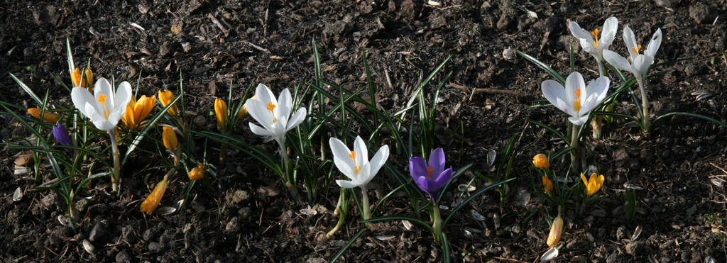 今日は天気が良くて暖かく、庭のクロッカスも元気に彩りを競っています。