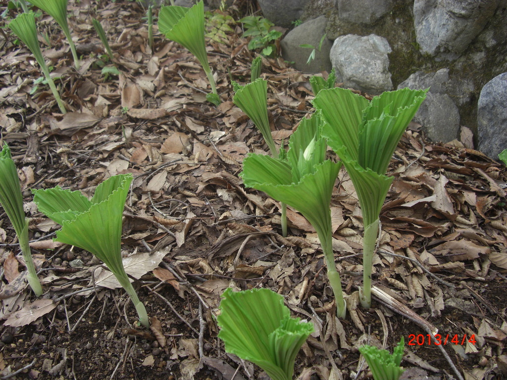 枯れ野に突然つんととんがった芽が出てぐんぐんのびていくもうつぼみがのぞいている