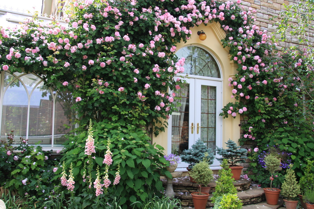 みごとな花付のイングリッシュロ-ズ、足元のアジサイとのコラボですね。