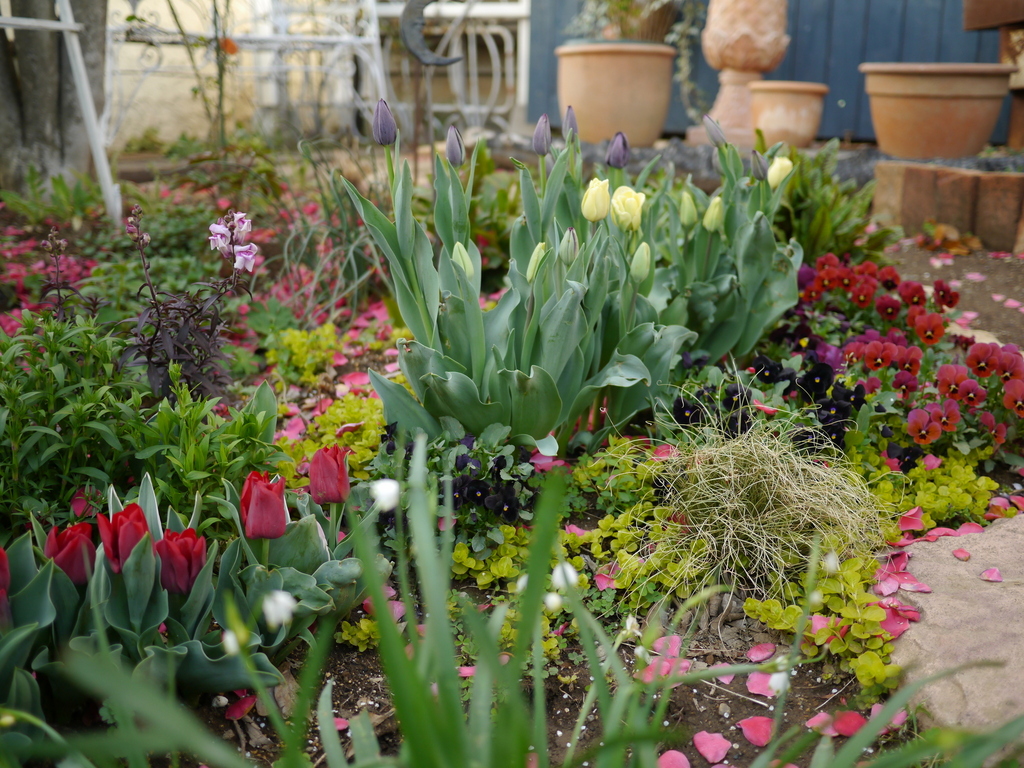 黒花や銅葉などを植えているコーナーです。チューリップももうすぐ咲きそうです。