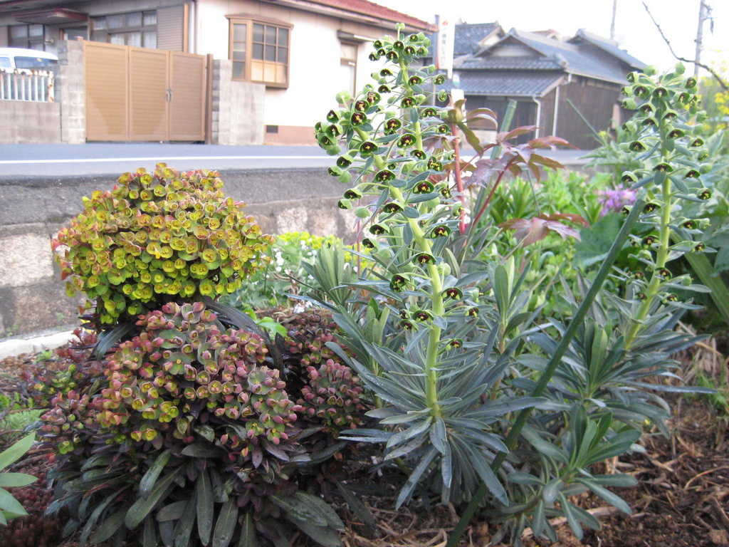 まだまだ駆け出し、小さなガーデンでグラベル風にしてみたい。ユーフォルビアが朝日に小躍りする。