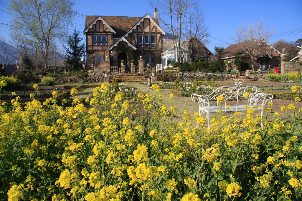白いチューリップと黄色い菜の花の春らしい素晴らしいお庭ですね!