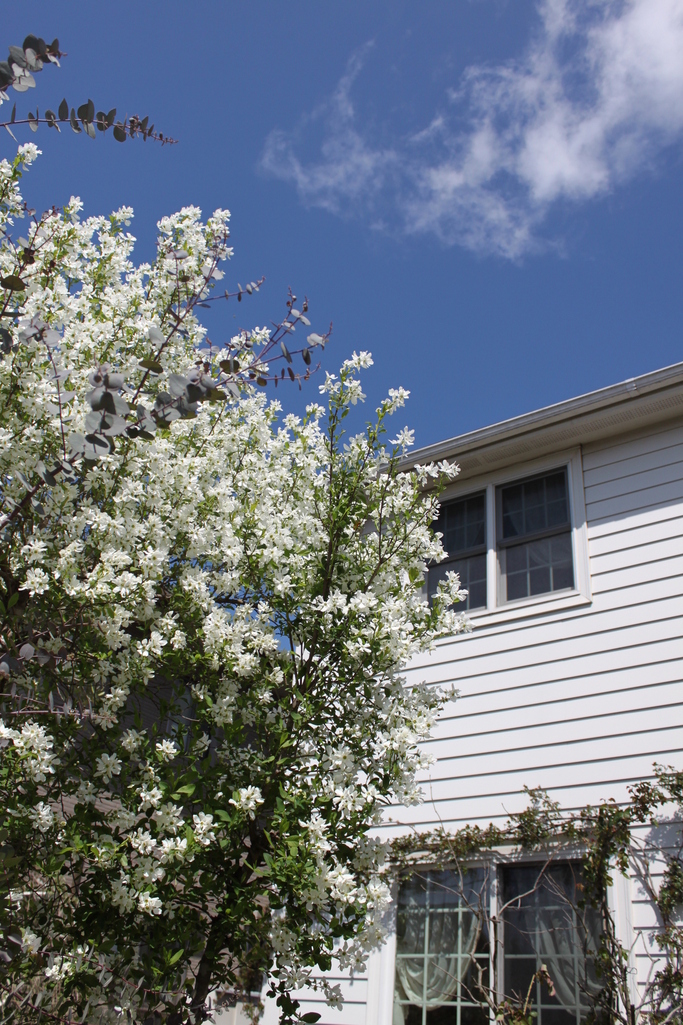 眩しい青空に、真っ白な利休梅がよく映えていますね、綺麗!