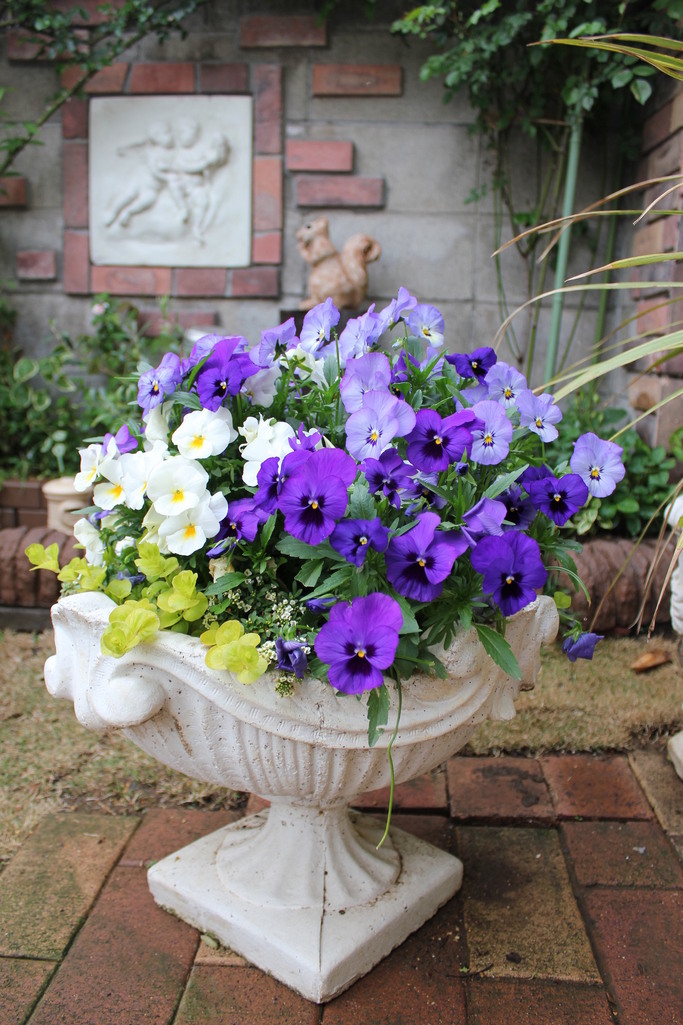 素敵な鉢に、大きく広がったパンジー、素敵な寄せ植えですね♡