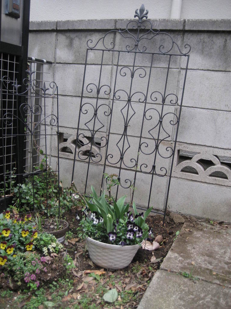 庭に記念に「ビエールドローサンヌ」を植えました。一緒に4枚の花弁の下を向いて咲く紫のクレマチスを植えました。足元にはこれからスズランが出てきます。