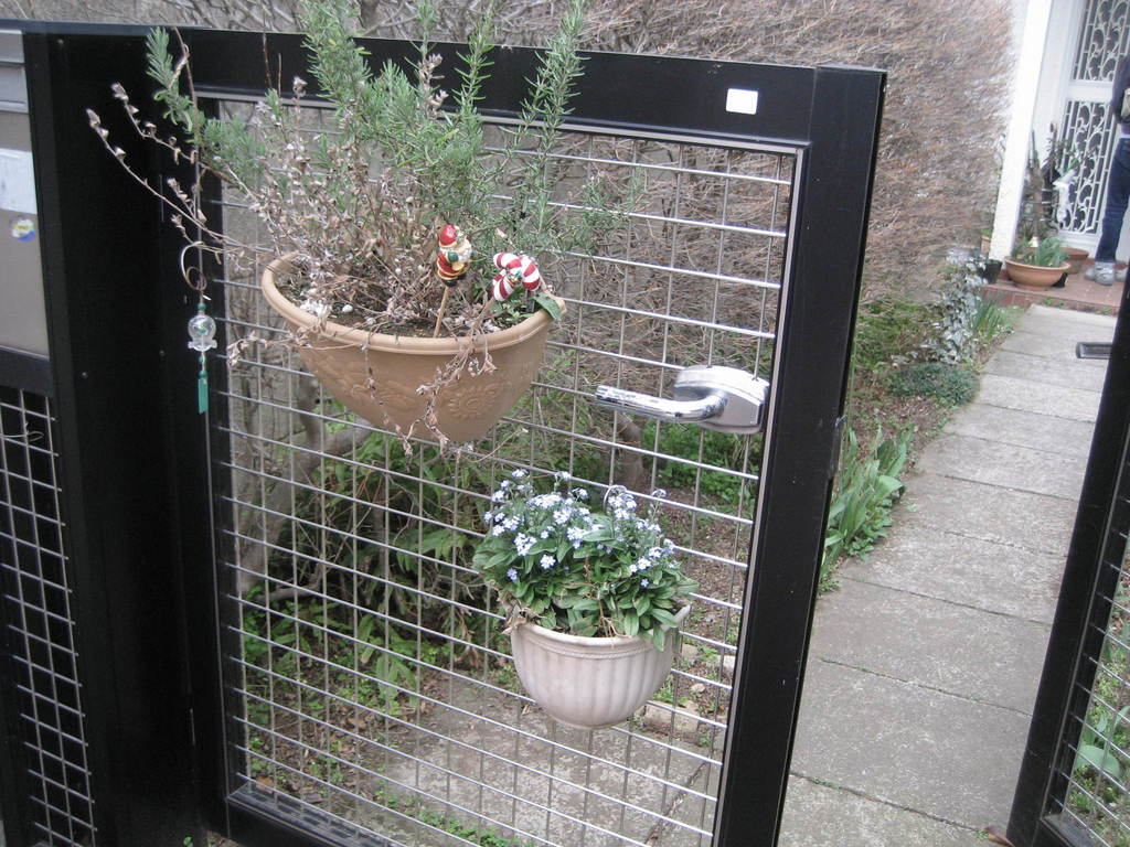 玄関の門扉にローズマリーと忘れな草のハンギング。