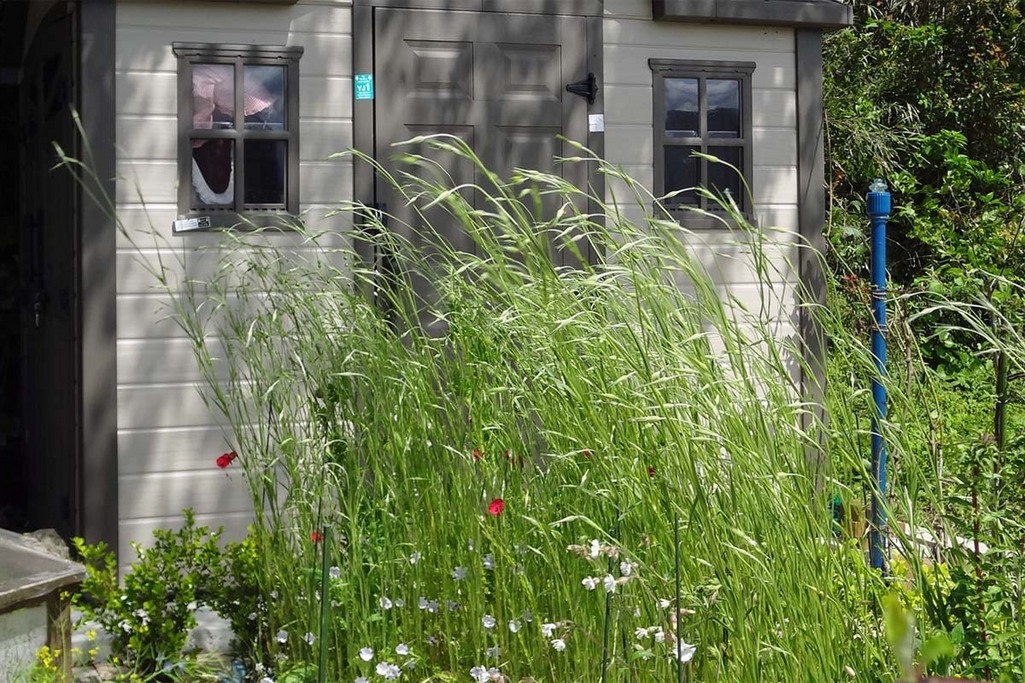 背の高い草花が風に揺れています。案山子さんもシェッドに避難。蕾がたくさん出てるけど、寒暖の差が激しく、開花はまだかなあ~
