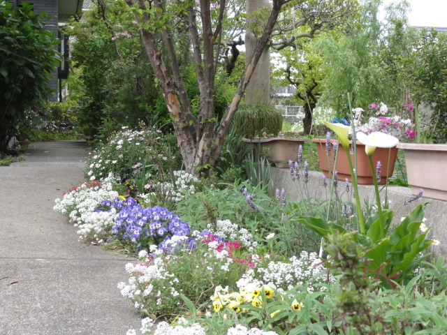 春の花がいっきに咲き始めました。アメジストセージの葉っぱがいいアクセントになっています。