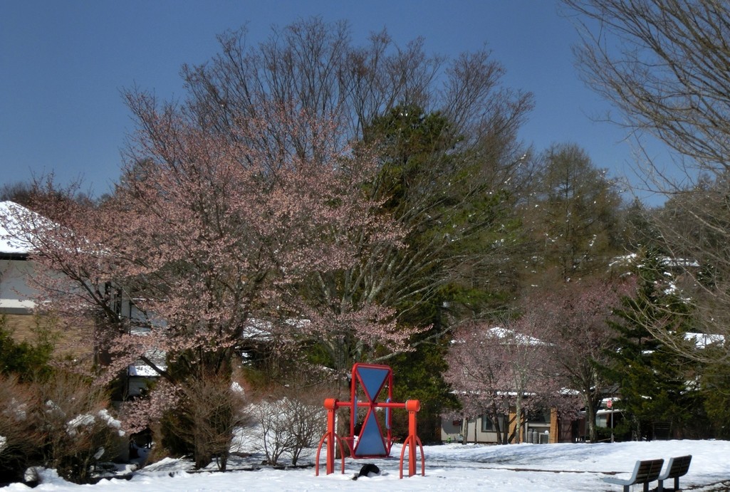 先週から咲き始めていた公園の桜も昨日の大雪にはさぞ驚いたことでしょうが、今朝の青空を背景に綺麗な花を見せてくれています。
