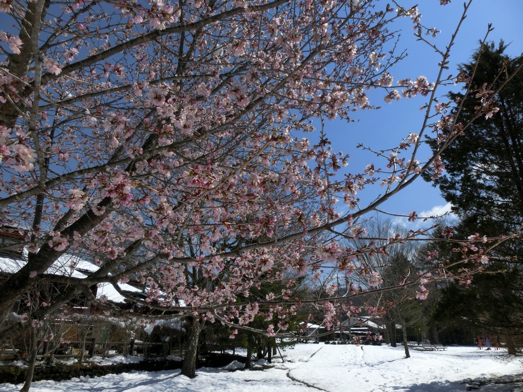 雪と桜、不思議な光景です。まだまだ雪がふるんですね!