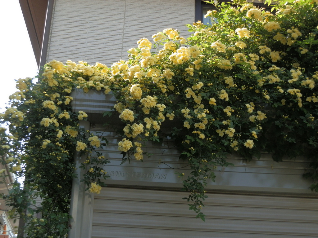 我が家のモッコウバラが満開です。ガレージの屋根に誘引してグリーンカーテン代わりです。これでも鉢植えです(^^;