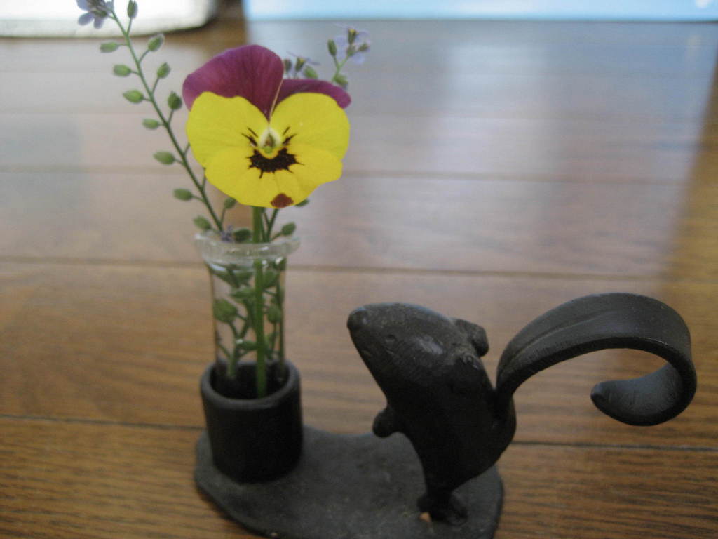 庭のビオラと忘れな草を八ヶ岳倶楽部で買った手作りの一輪ざしに飾りました。