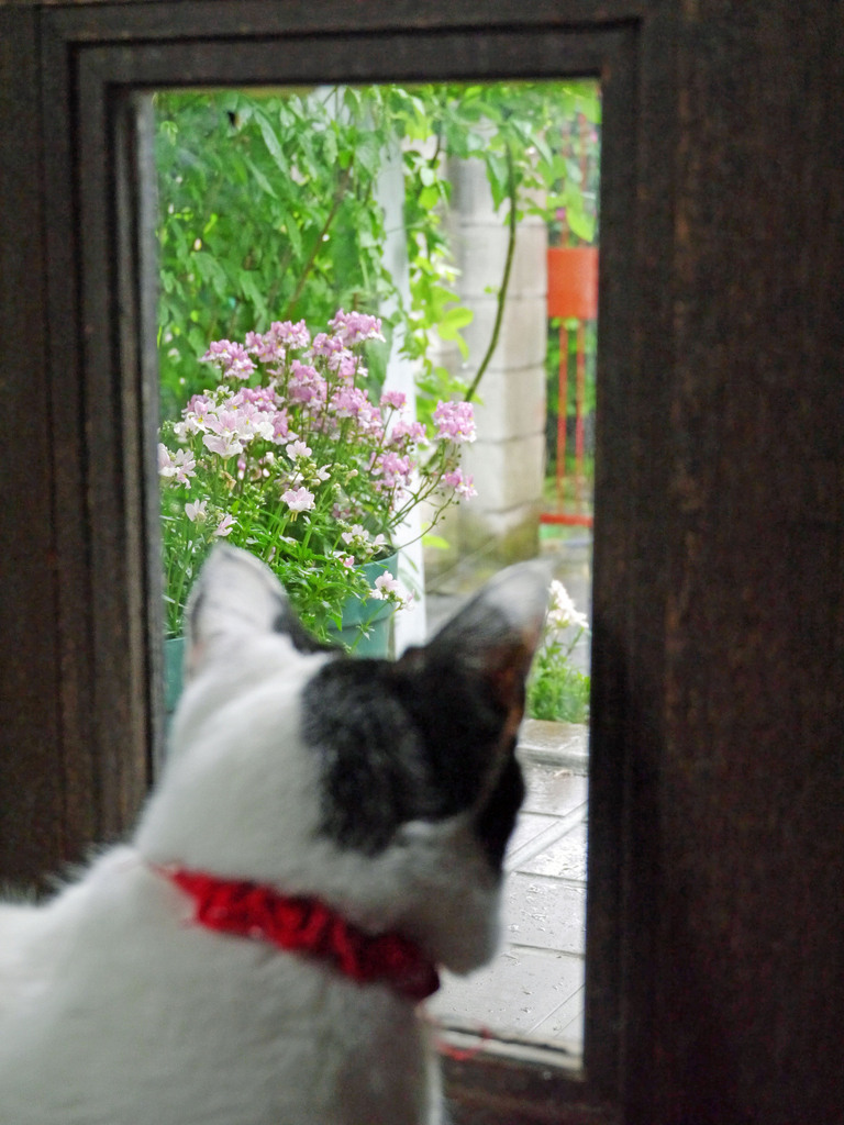にゃんこの後ろ姿と外の花がとっても素敵にコラボしてますね(*^^*)