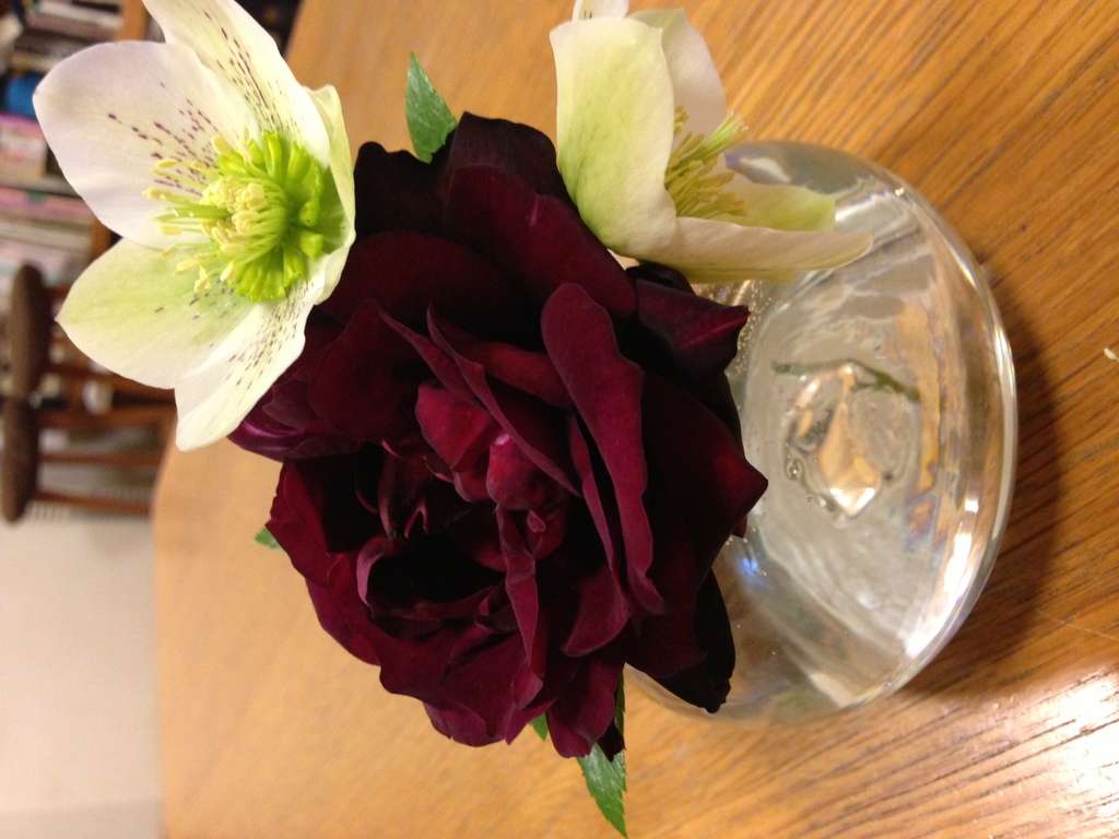 家庭訪問だったので、一番薔薇でお出迎え。テーブルに邪魔にならない小さな花瓶を置きました。(フランス デュブリュイ、クリスマスローズ)