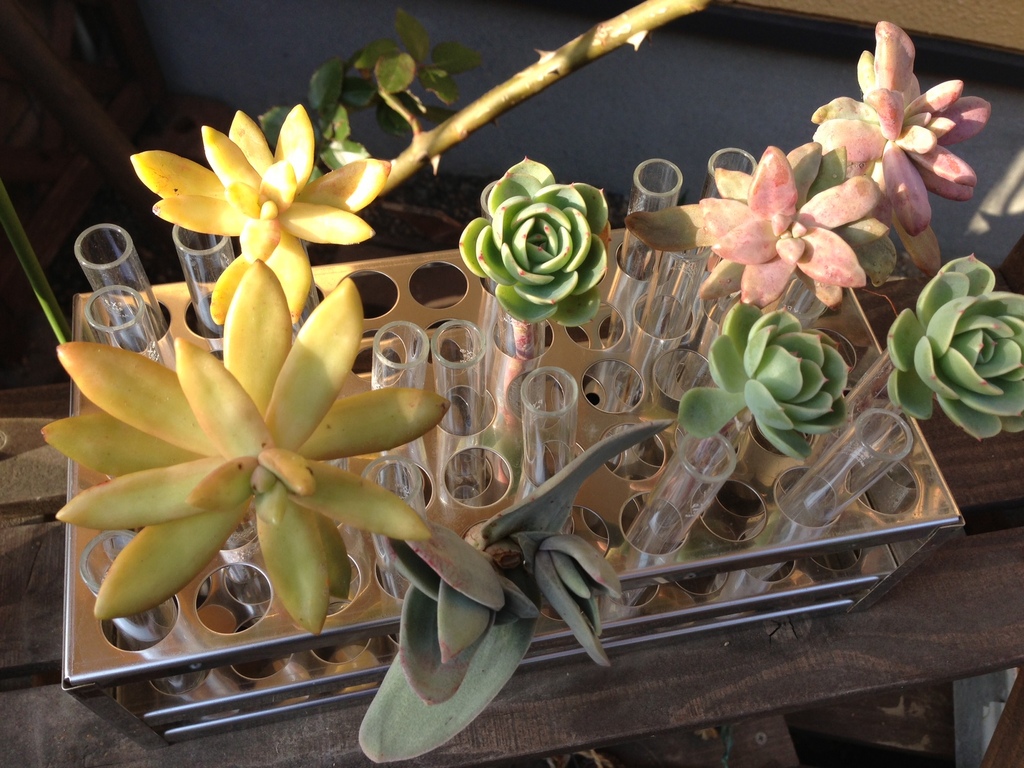 切枝を試験管に差して乾かすと、根っこが自然と伸びて簡単に増やせます。