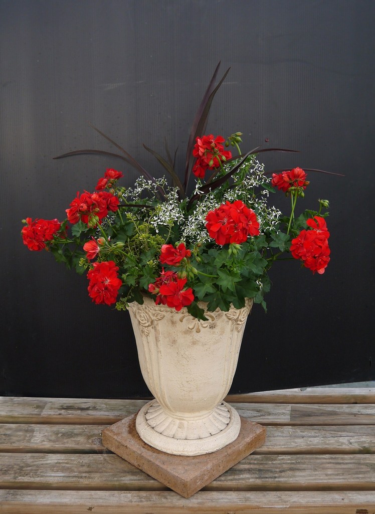 赤いゼラニウムの寄せ植え