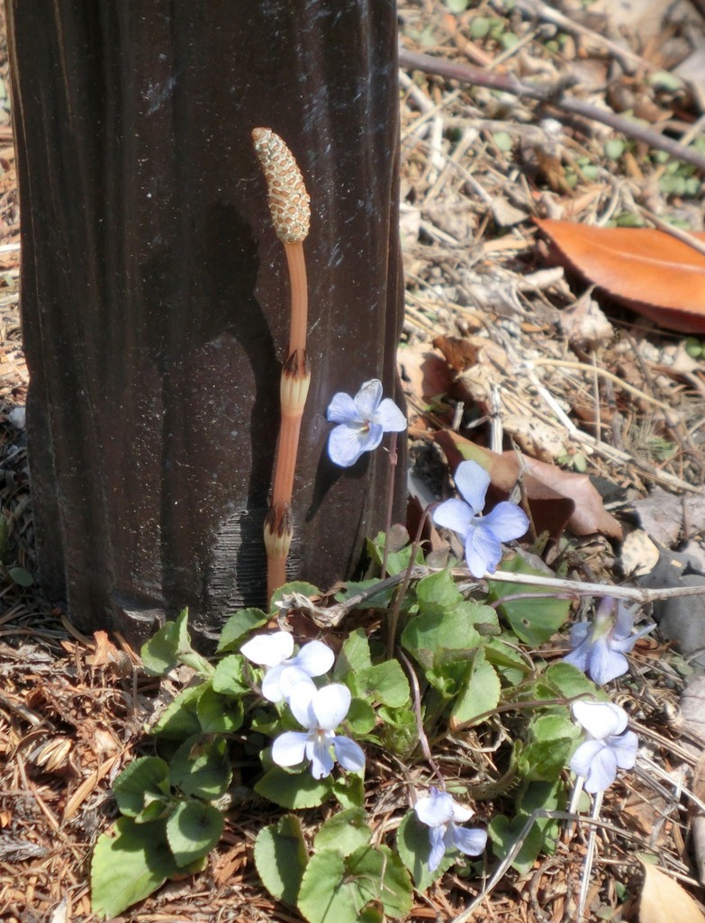 散歩中に道路脇の杭の足元にスミレとツクシが寄り添うように咲いているのを見つけました。