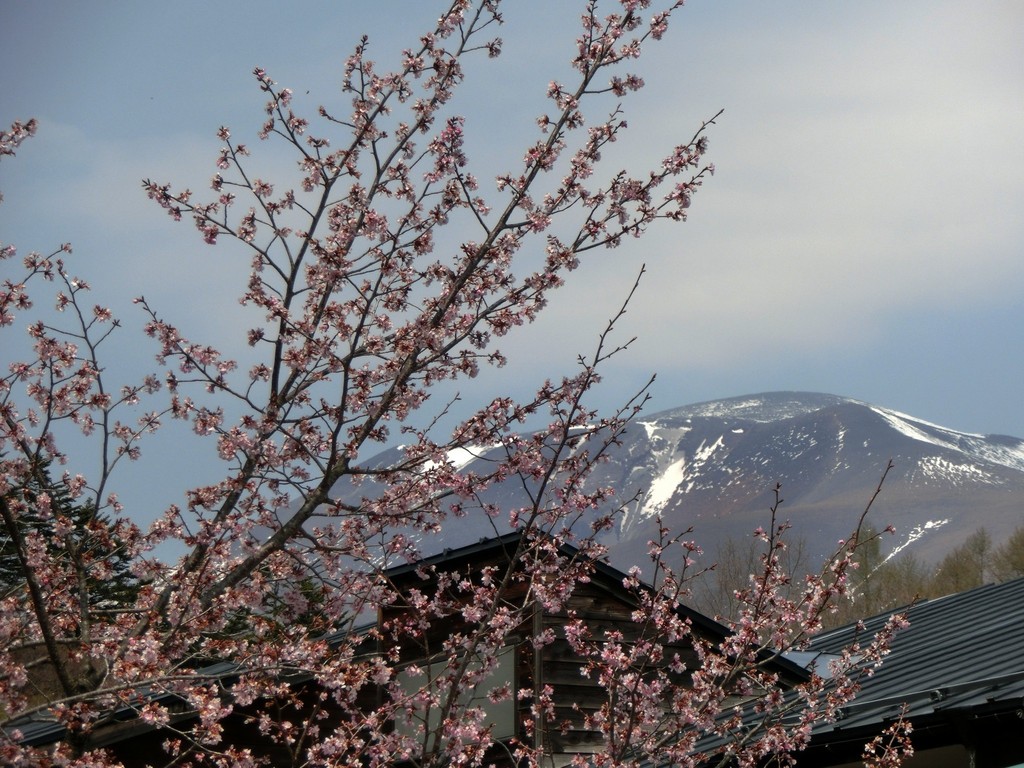 残雪を抱く山を背景に桜が咲いて、雪国の遅い春の訪れの喜びを感じる素敵な一枚です。