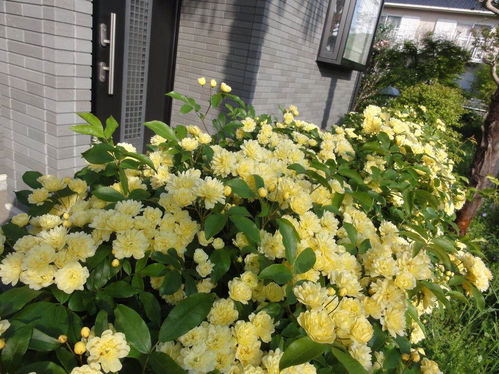 今年は3月下旬につぼみを発見して04/18に開花、暖かいかなと思ってたら寒くなったりして04/29に満開になりました。開花後、天候にも恵まれところどころに葉っぱの模様は入っていますが薄い黄色の八重の花のじゅうたんが出来ました。