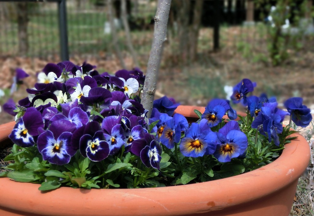 鉢植えのクラブアップルの足元でビオラがきれいに咲きそろってきました。