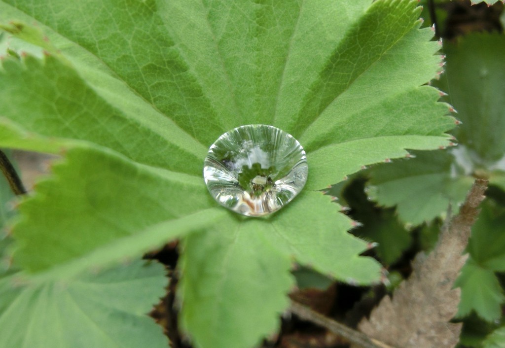 今朝降った雨が、やっと葉が茂ってきたアルケミラモリスの葉の上にきれいな水玉を乗せていました。