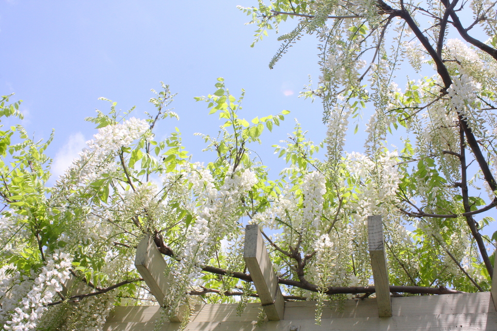 白いパーゴラに白い藤。あでやかですね~。和風な感じにものすごくおしゃれなテーストがなにか、外国っぽいなって、。。。ほんとに憧れます。素敵~。(^。^)y-.。o○