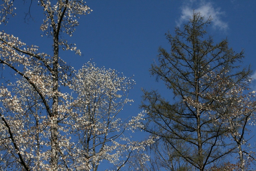 今日は五月晴れで真っ青な空が広がっていますが、気温は10度と寒くとてもクールビズどころではありません。寒さのおかげ(?)でコブシがまだ美しさを保ち、一方でカラマツが青く芽吹き始めています。