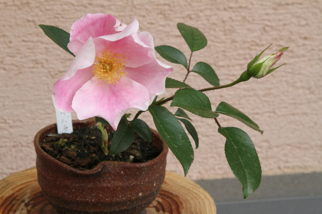 ハトヤ薔薇が可愛い10cmの鉢にやっとの思い出咲きましたよ。でも可哀想だから早い目に花をカットしました。
