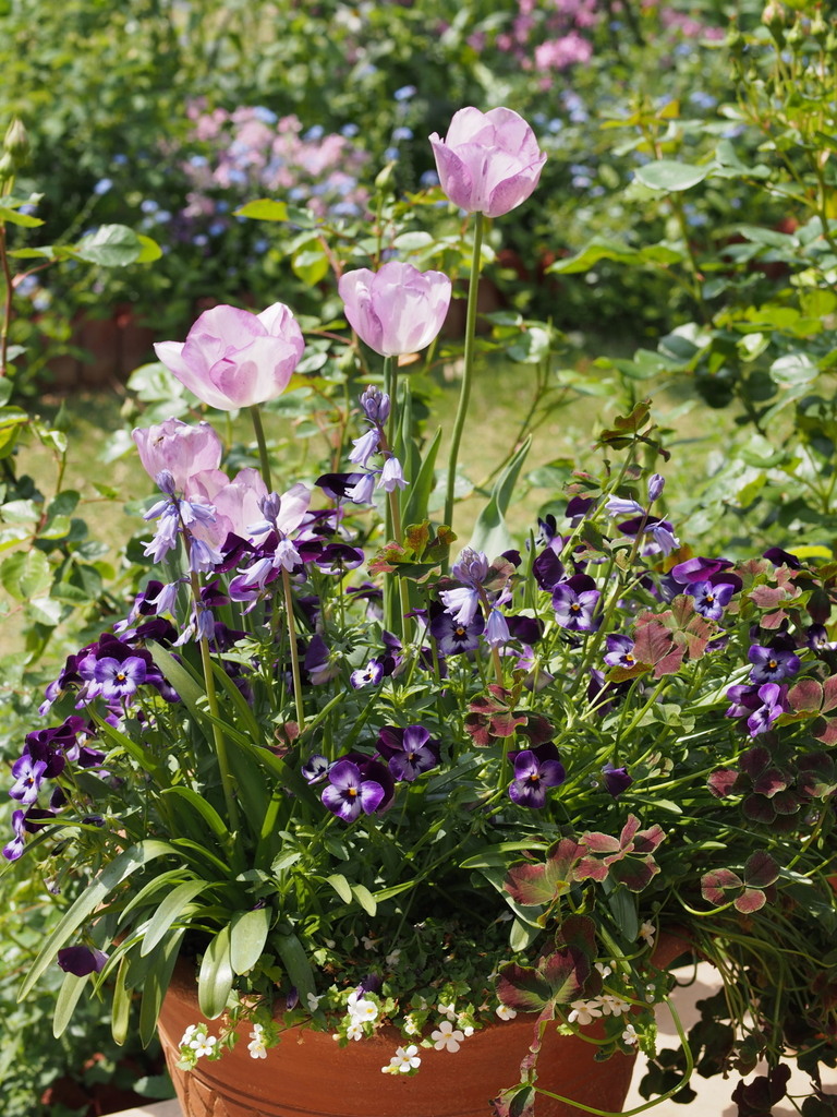なんて綺麗な寄せ植えでしょう! チューリップがとても可愛らしいです。