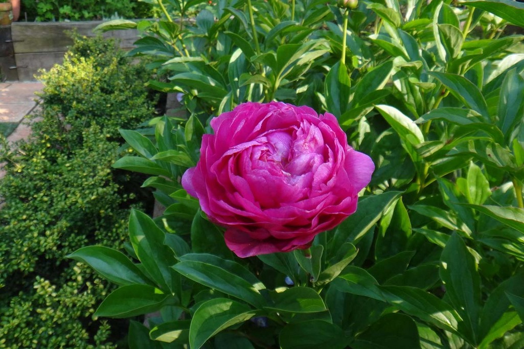 シャクヤクのお花が大好きです。でもいつも葉っぱだけが出てお花になりません。やっぱり手入れが。。。。。綺麗に咲いてとてもきれいですね。一輪だけでも、とても存在感があり時々お花やさんで買ってたのしんでいます。お庭でたのしめるなんて素敵ですね。(^。^)y-.。o○