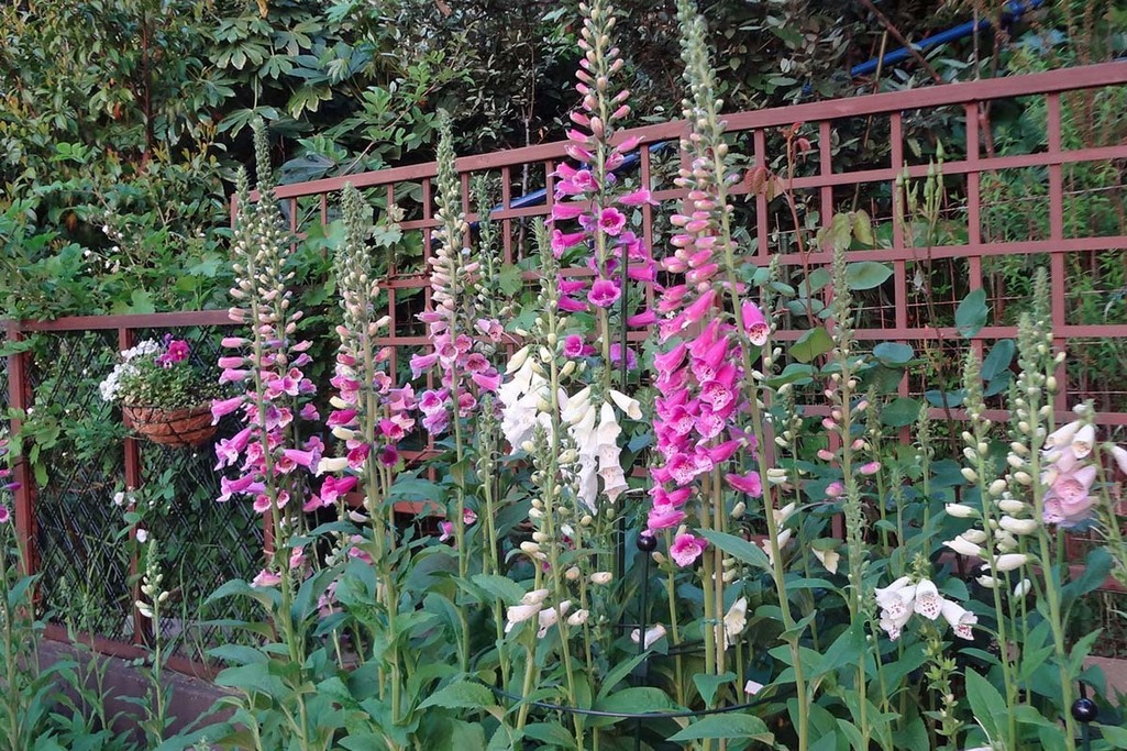 ジギッタリスの縦のラインとバックのトレリスのラインが重なり美しいです。