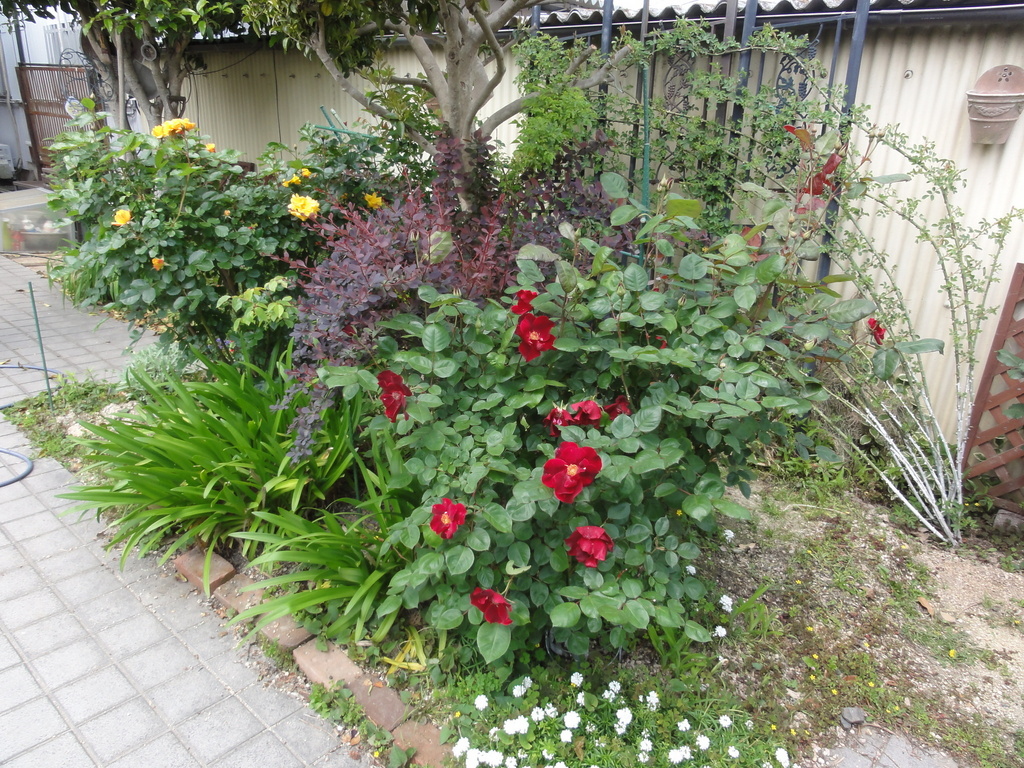 壁沿いにはL-CL キューランブラー、前口にはF ダスキー・メイデン、サザンカと赤い葉色のメギ、向こう側はF ゴルトマリー'84、株元にはイベリスとアガパンサスを植えています。