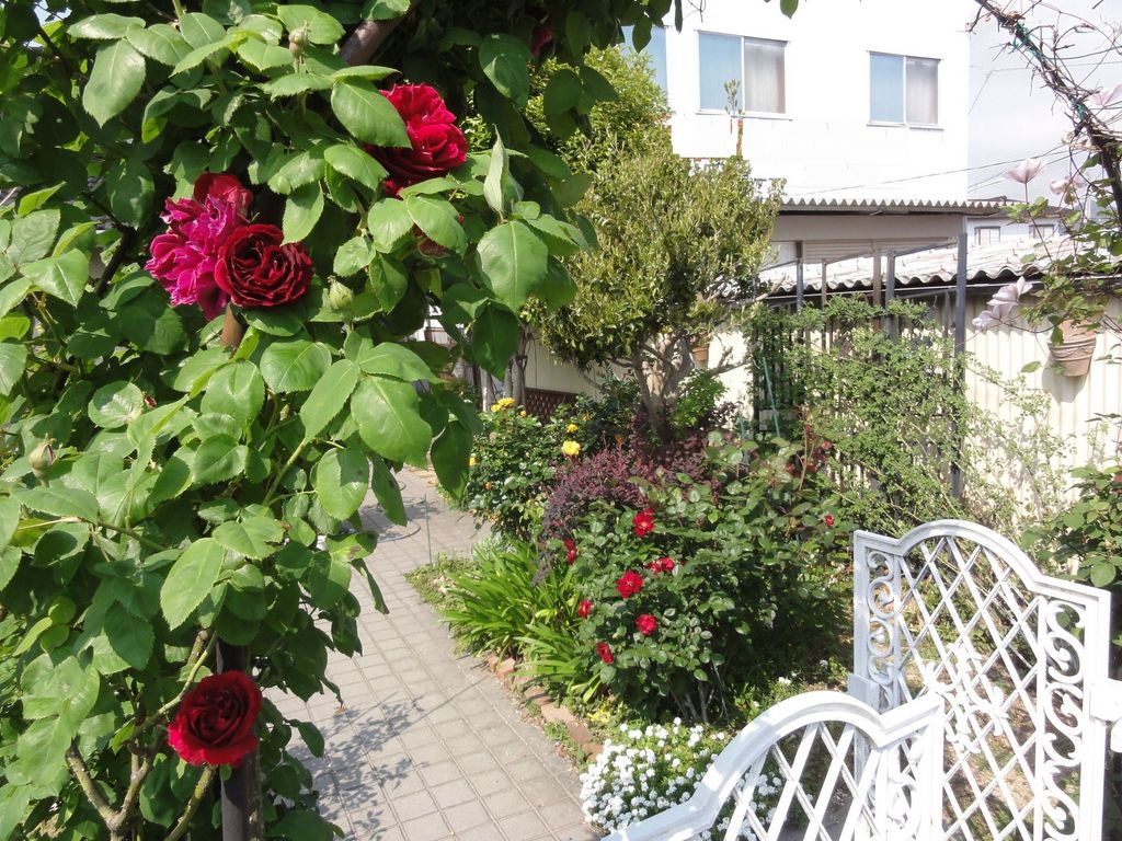 アーチのバロン、アーチ越しに見えるお庭のバラ、少しづつ咲いてる花が増えていっています。