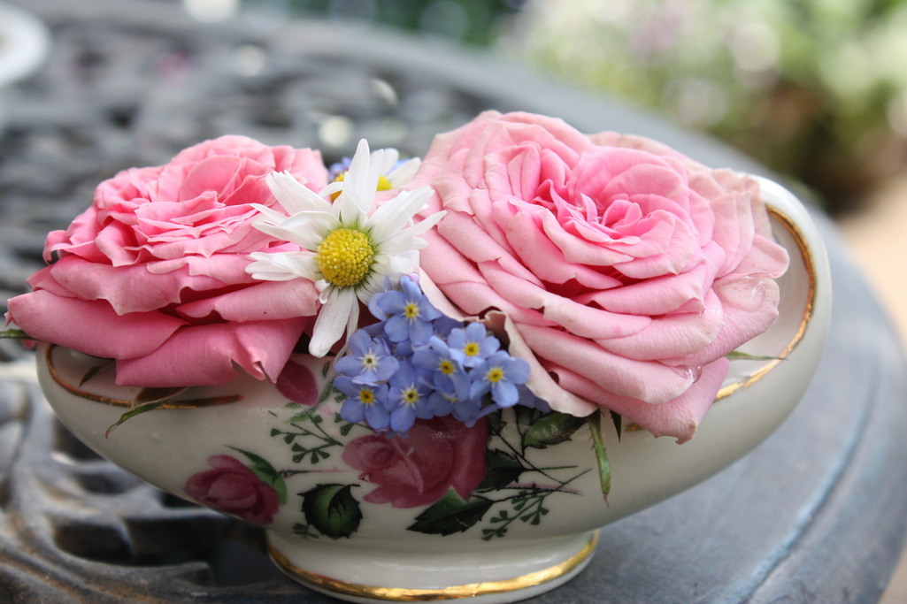 ミニバラのピンクコルダーナに忘れな草とイングリッシュデイジーを添えた小さなアレンジ。